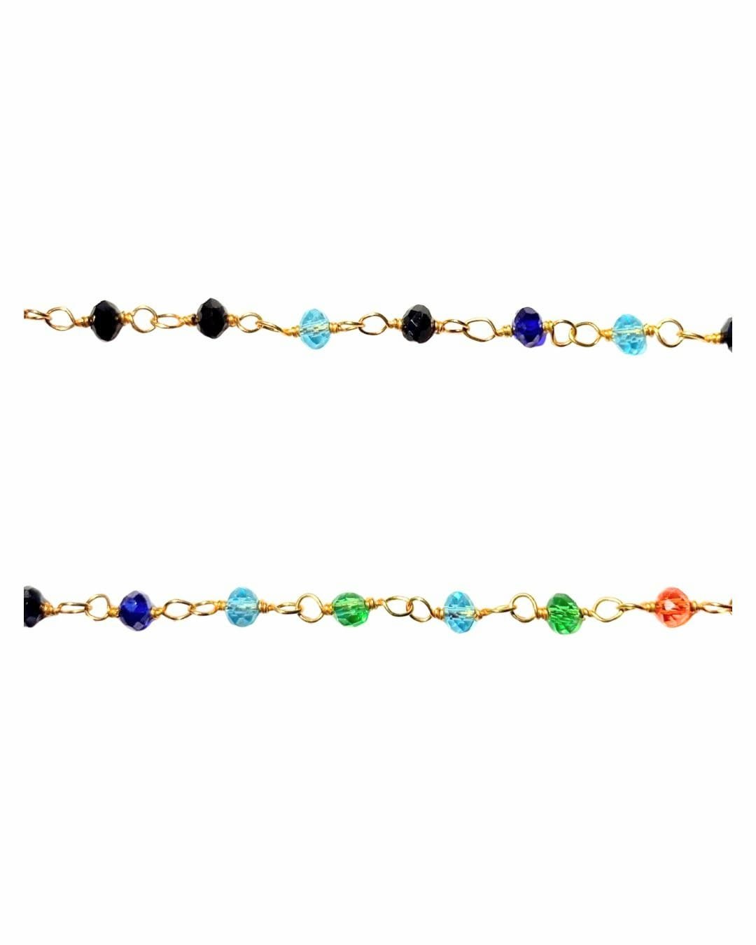 Cadena dorada, chapada en oro, con cristales de 2 cm multicolor: azules, verdes, negros y naranjas. La cadena mide un metro y puede utilizarse para llevar cualquier colgante. Por las facilidades que brinda el cierre, de acero inoxidable 304, puede usarse con doble vuelta.