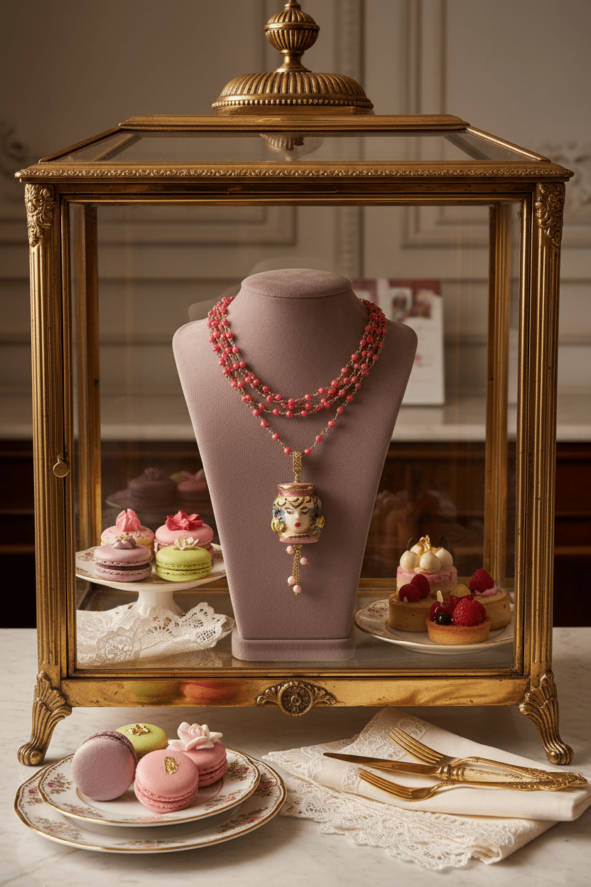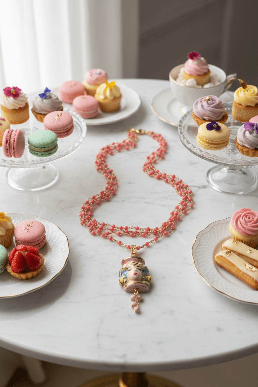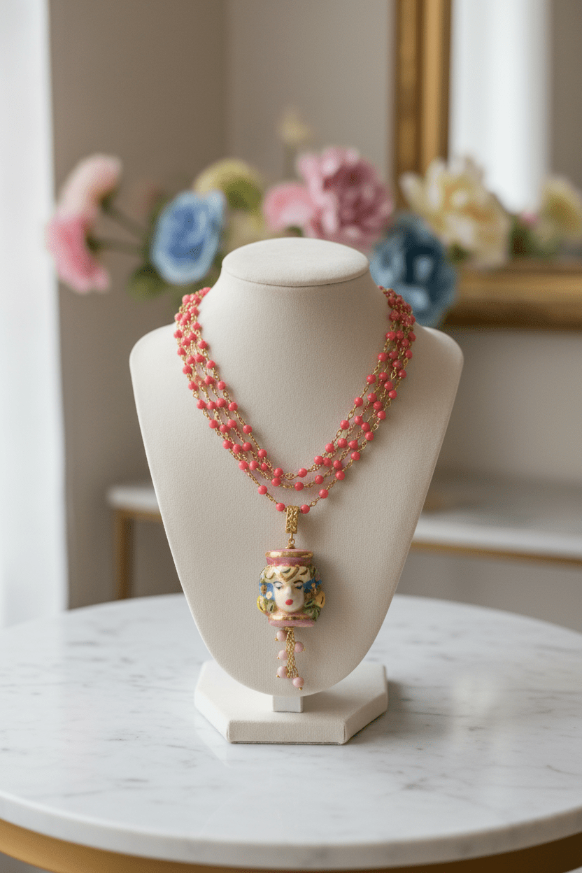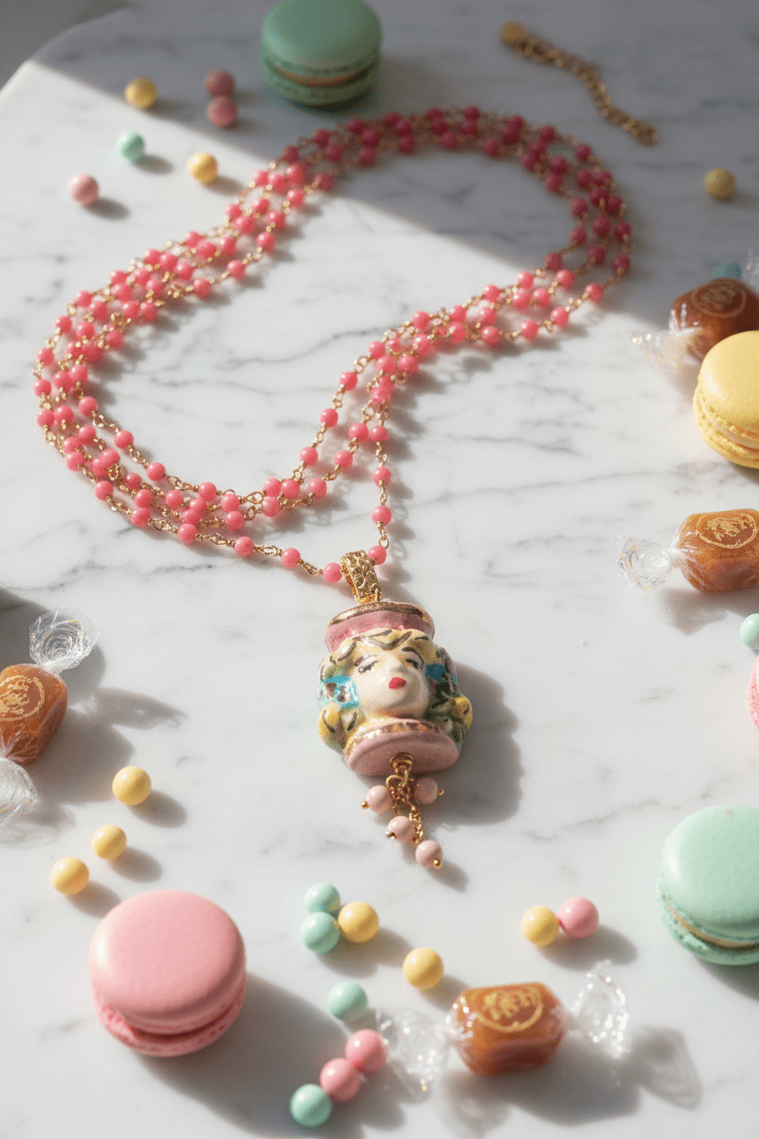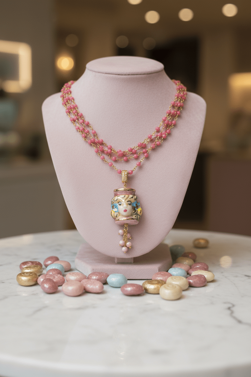 Collar de Filippa Federica en tonos nude y rosas. La reina tiene como terminación piedras en el mismo color. La cadena está realizada a mano con cuentas de piedras  naturales. Es de color dorado y tiene cierre por lo que puede utilizarse junto con el colgante o por separado; larga o con doble vuelta. Medida del colgante: 7 cm de largo por 3 cm de ancho. Medida de la cadena: 1 metro de largo.