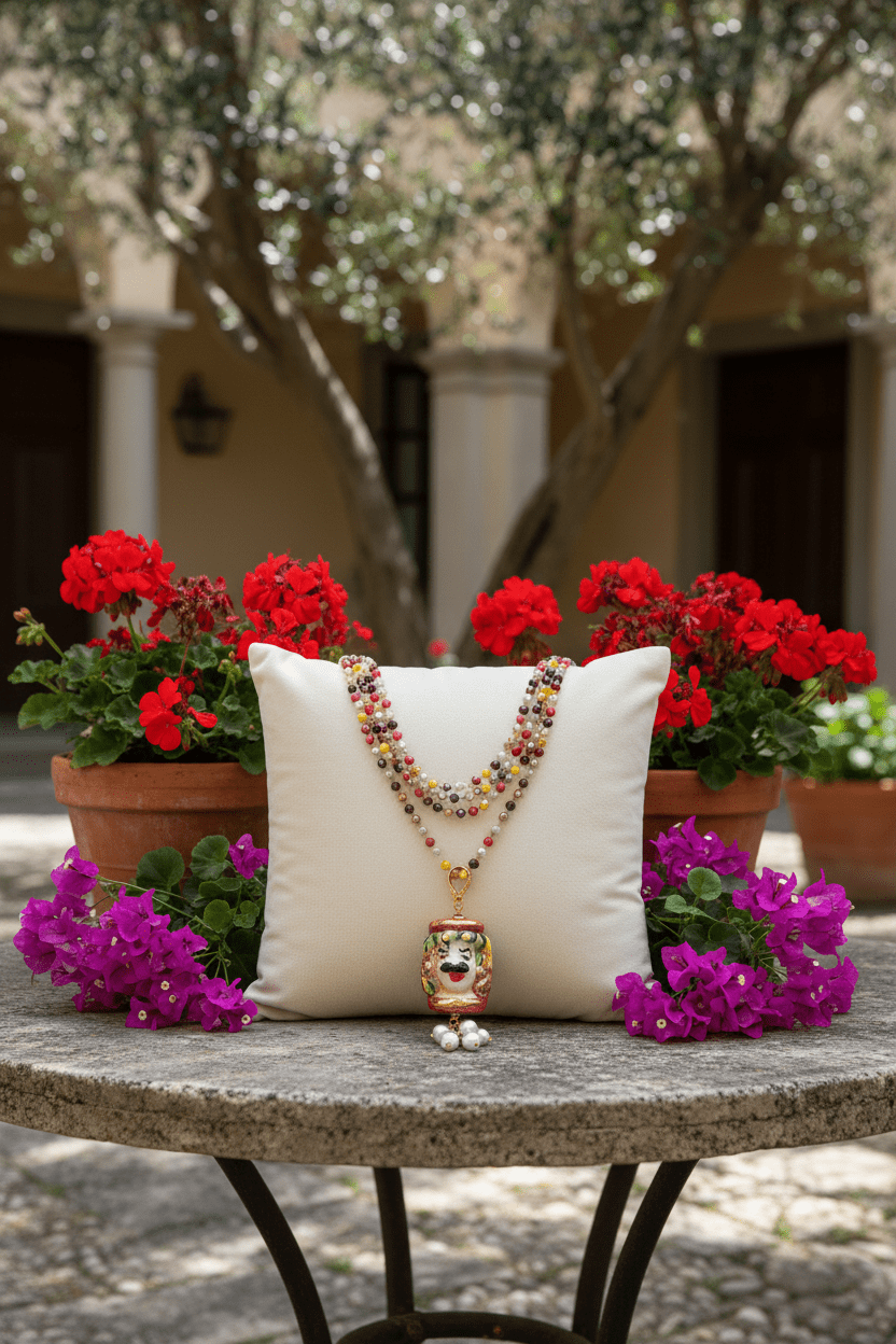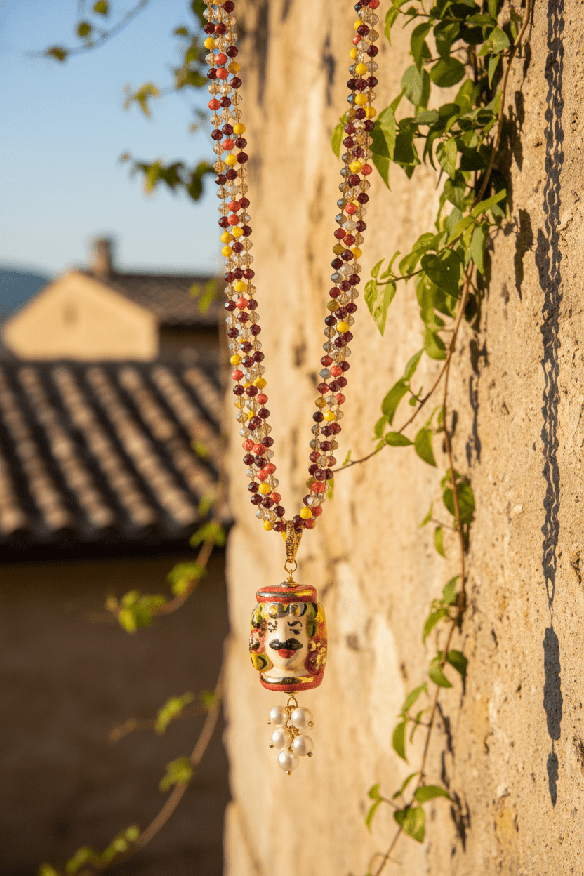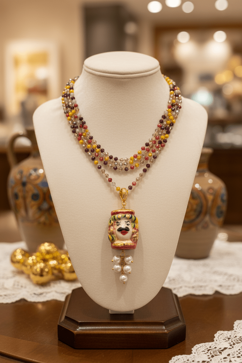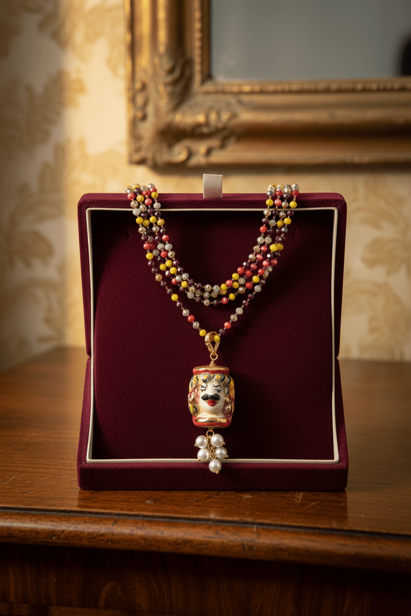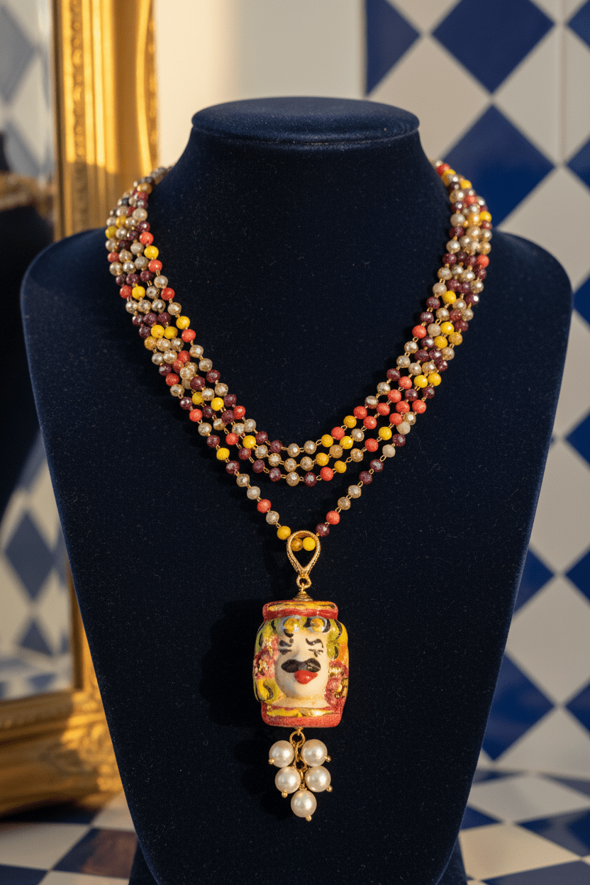 Collar de testa di moro, con el famoso Filipo Federico. El colgante es artesano y está elaborado en Sicilia, pintado a mano y esmaltado. En él predominan los colores rojos y de la cabeza del rey cuelgan piedras en color blanco. La cadena que viste al moretti es de cristal, de un metro de largo, intercalando piezas en cristales de diferentes colores que dan vida al colgante. Puede llevarse con doble vuelta. La cadena tiene apertura por lo que ambas piezas pueden utilizarse solas o separadas.