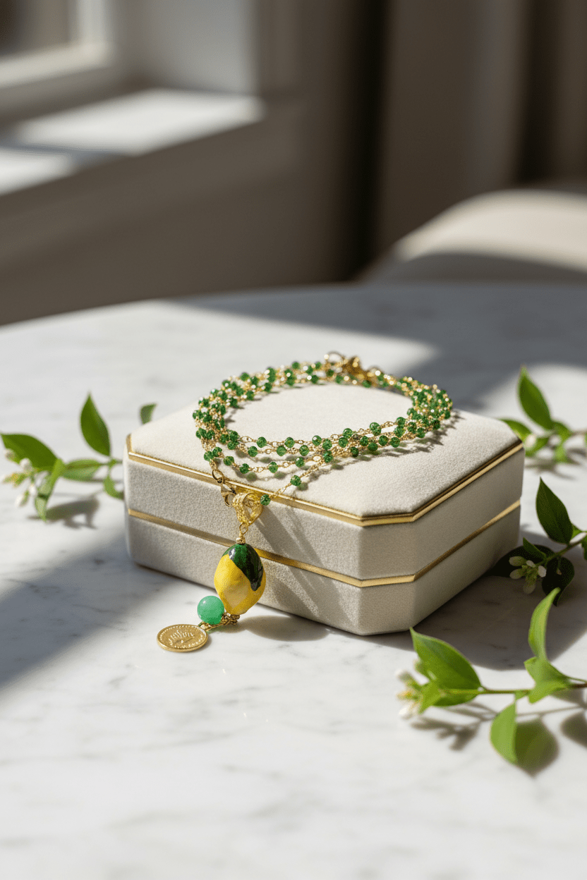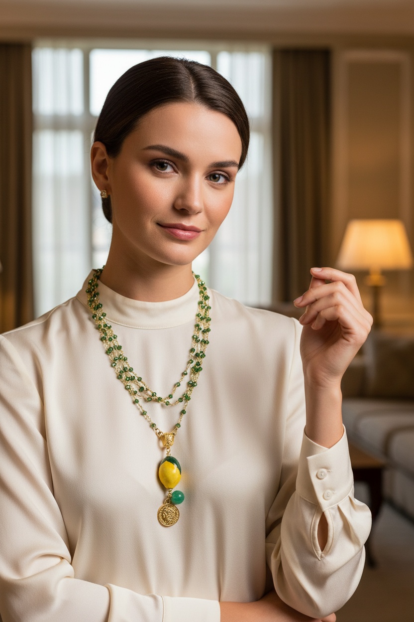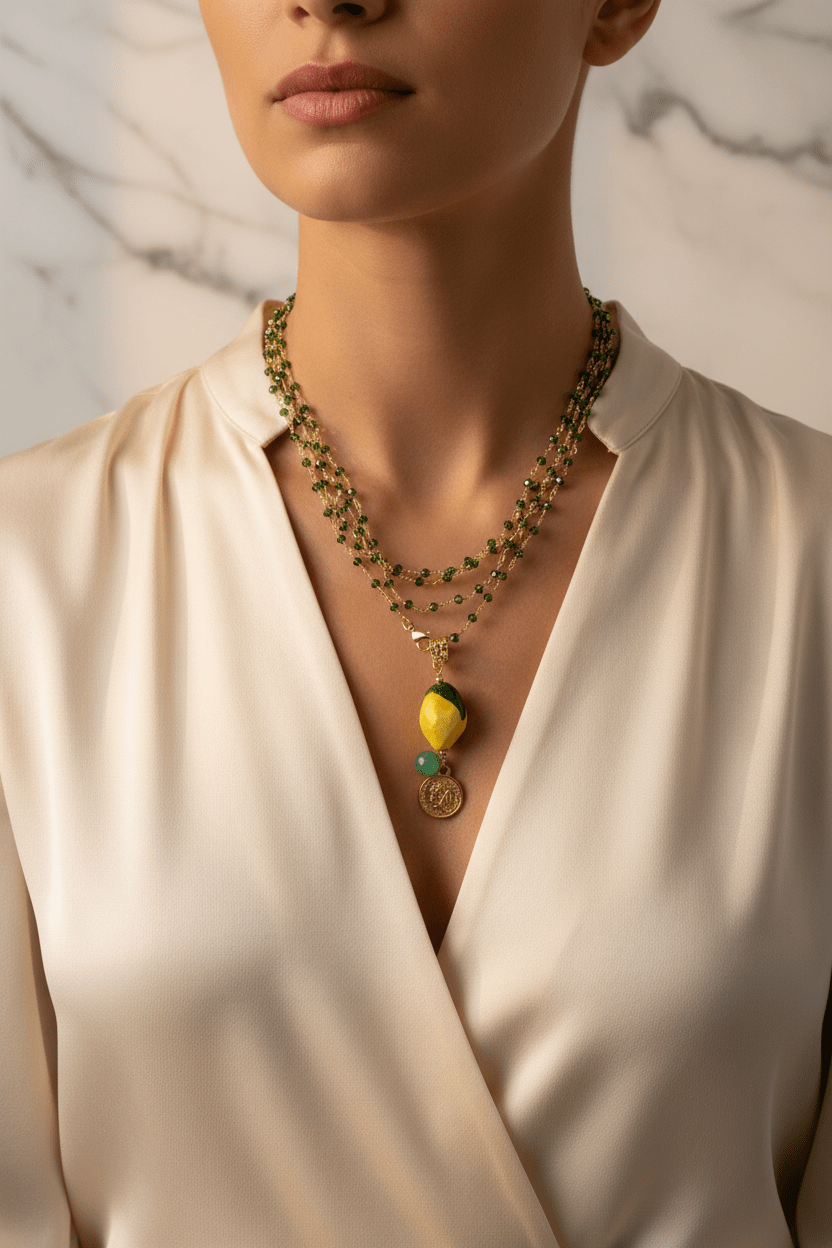 Collar con limón, moneda y piedra natural. Con cadena de piedras de cristal brillante en verde que combinan de forma perfecta con el colgante. La cadena es de un metro y cuenta con cierre de acero inoxidable. Esto permite que ambas piezas puedan utilizarse juntas o por separado. Todas nuestras piezas han sido elaboradas en Sicilia, Caltagirone, por artesanos. Cada pieza es única por lo que pueden existir variaciones de color y tamaño. Medida del colgante: en torno a 8 cm de largo