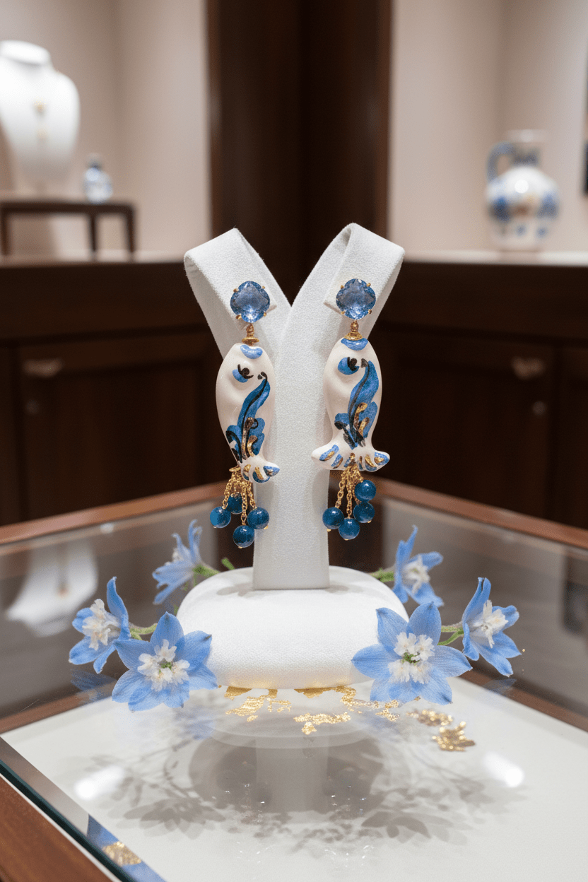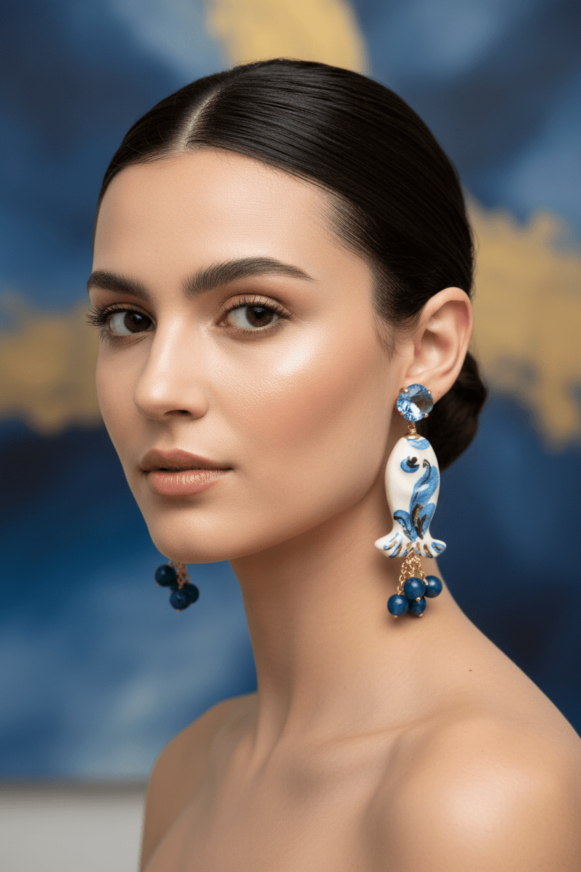 Los pendientes del pez Wesley son elegantes y favorecedores. Mezclan el azul fuerte y el sabe con el blanco. Tienen como terminación un cristal azul que ilumina y bajo el pez piedras naturales azul noche. Todas nuestra piezas están esmaltadas y elaboradas por artesanos en Sicilia. Cada joya es única. Pueden existir variaciones en la forma y color de los productos, puesto que están elaborados a mano. Medida de los peces: 6,5 cm