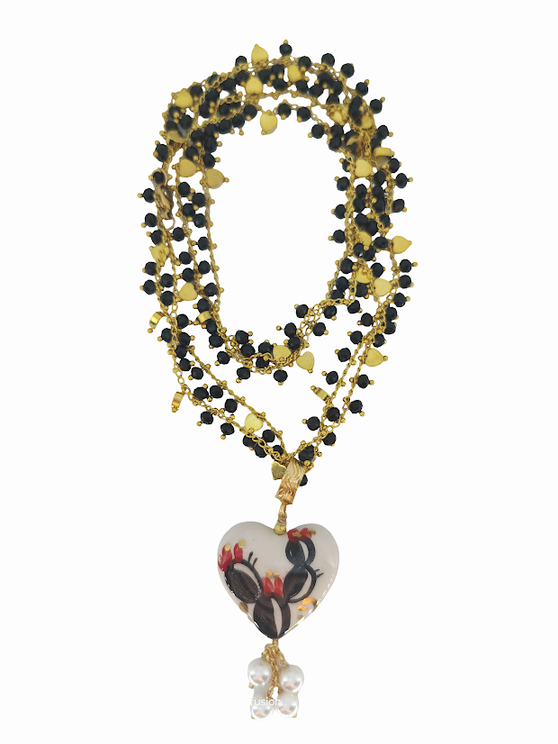 Precioso collar de cerámica con forma de corazón que tiene pintado un cactus negro y rojo en su interior. La cadena está realizada a mano. Es dorada y lleva cristales negro intercalados con corazones. El colgante mide en torno a 6,5 cm. La cadena mide un metro de largo y puede utilizarse con o sin el colgante.