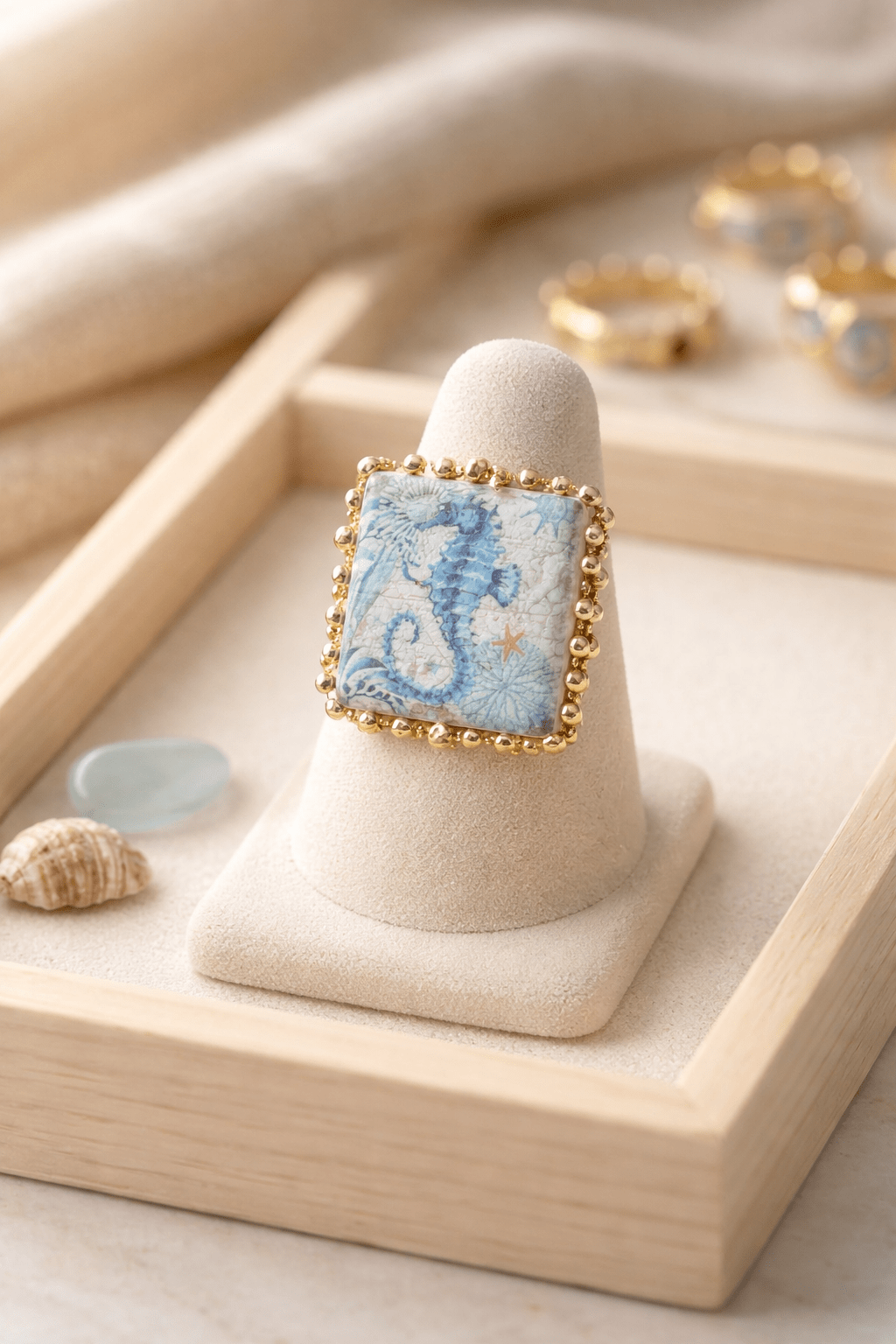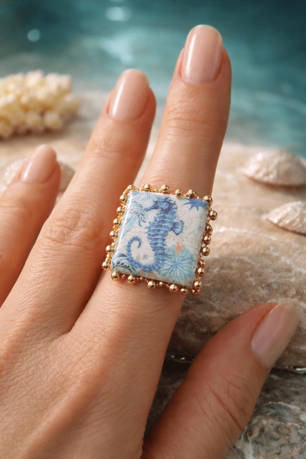 Anillo de cerámica elaborado a mano por artesanos sicilianos. Es adaptable, apto para cualquier talla e ideal para regalar. La pieza principal del anillo es un azulejo con dibujo pintado a mano de un precioso caballito de mar en tonos blancos y azules. La medida de la tesela es de 2,5 cm.
