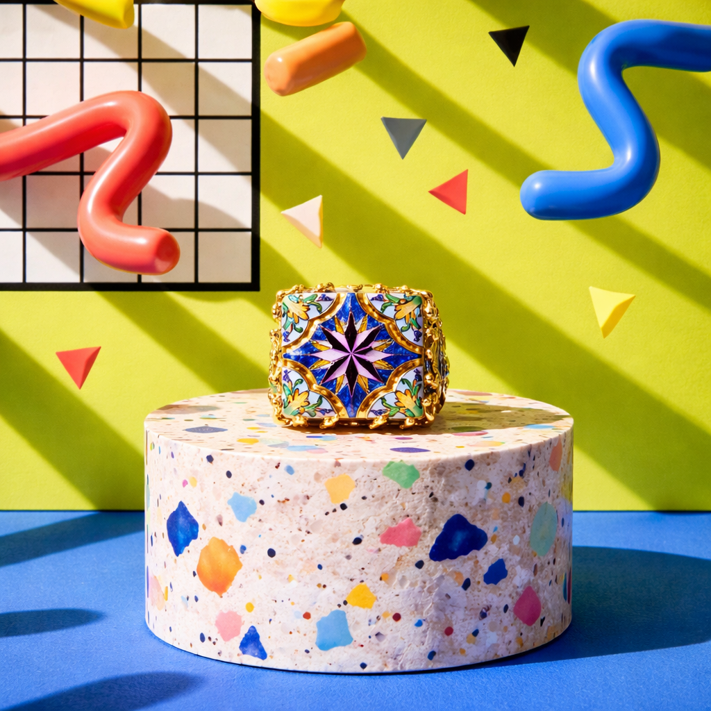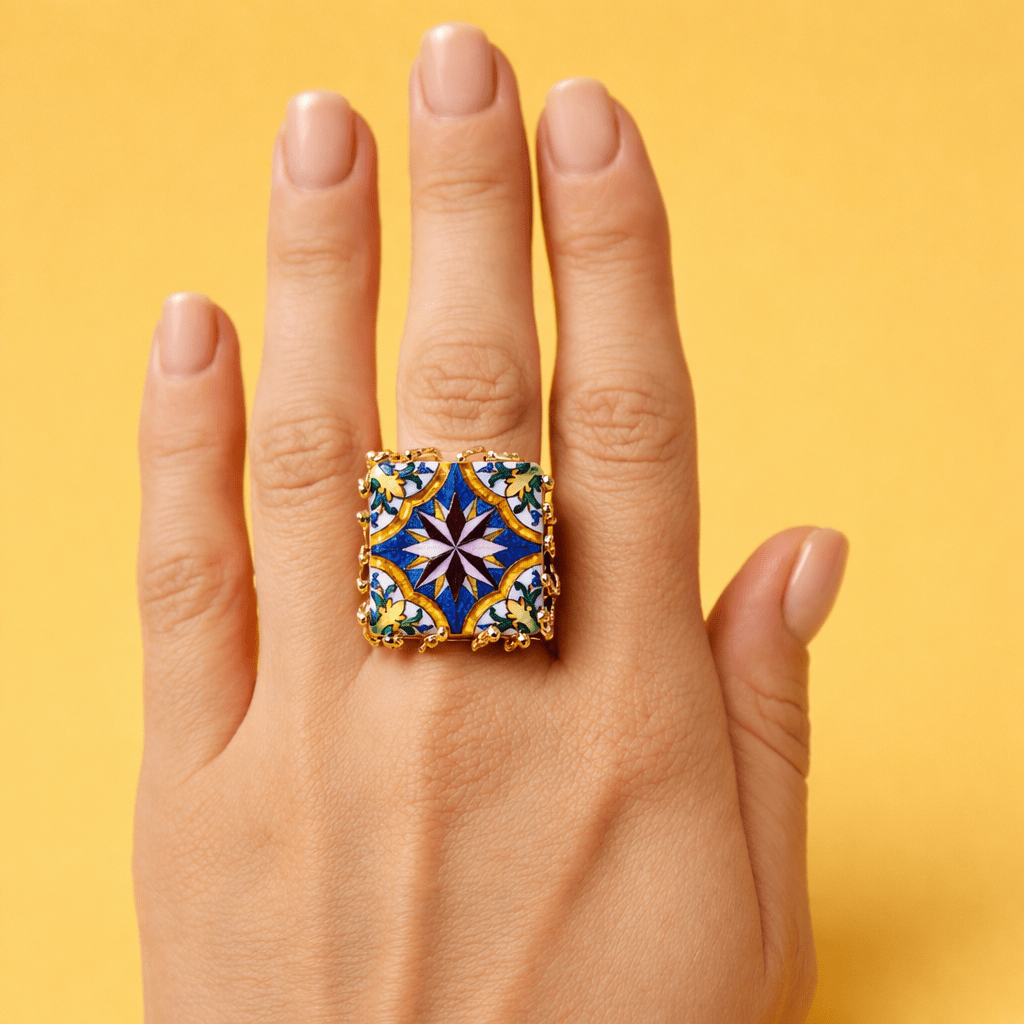 Anillo de cerámica elaborado a mano por artesanos sicilianos. Es adaptable, apto para cualquier talla e ideal para regalar. La pieza principal del anillo es un azulejo con dibujo pintado a mano de una estrella de puntas sobre un espectacular fondo italiano. La medida de la tesela es de 2,5 cm.