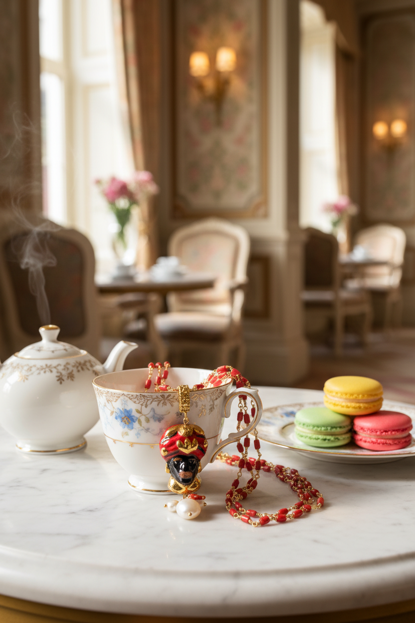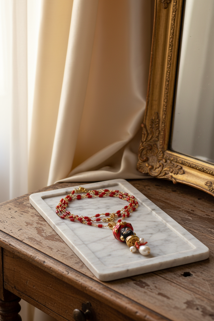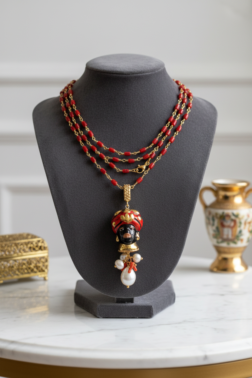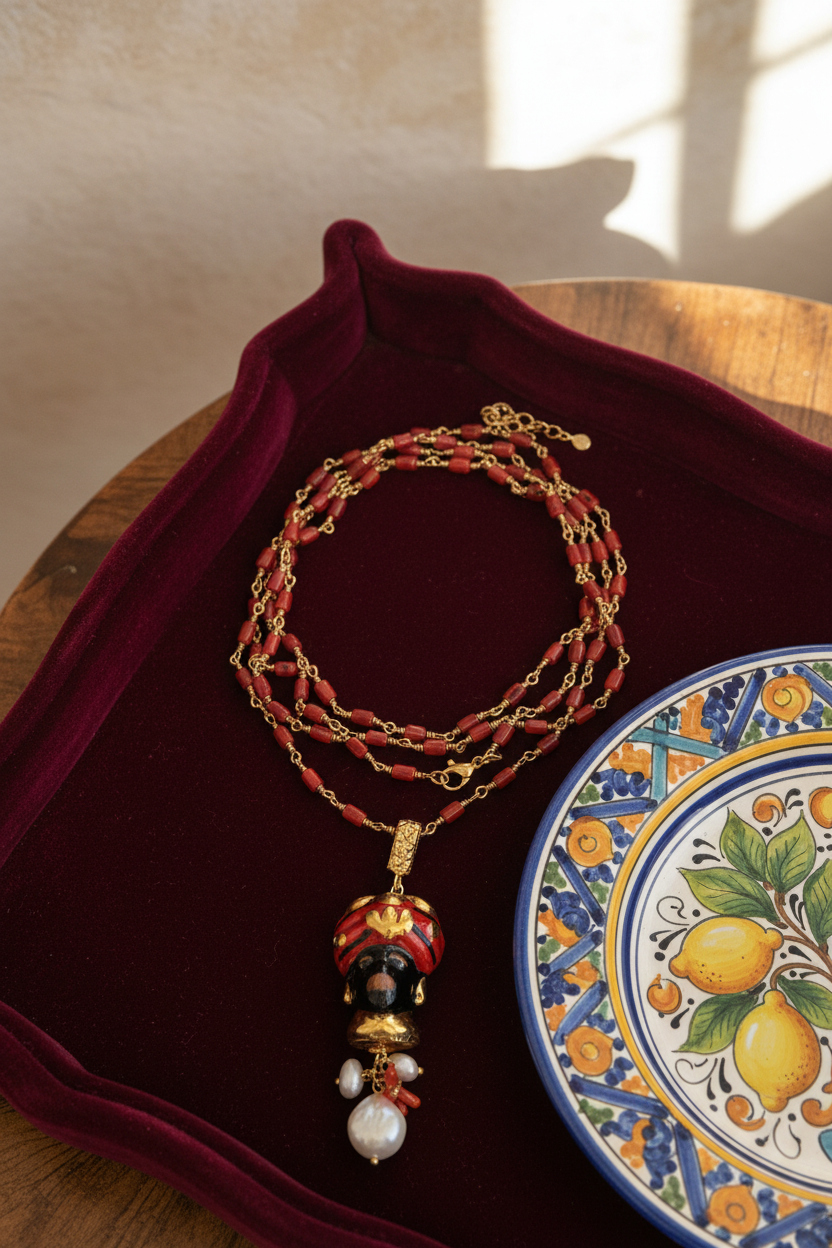 Collar del rey Bruno. Auténtico moretti italiano con perlas naturales y coral siciliano en su terminación. La cadena está realizada a mano con cuentas de coral siciliano. Con chapado dorado, tiene cierre de acero inoxidable por lo que puede utilizarse junto con el colgante o por separado; larga o con doble vuelta. Medida del colgante: 8 cm de largo por 3 cm de ancho. Medida de la cadena: 1 metro de largo.
