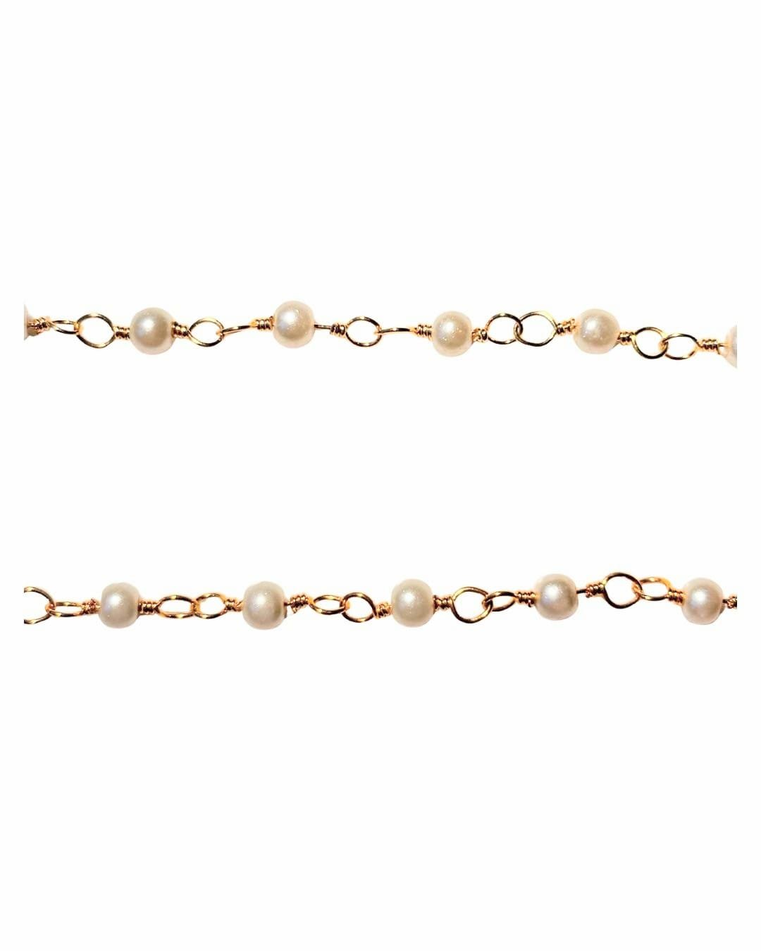 Cadena de cuentas (imitación perla). Está chapada en oro y mide un metro. Por las facilidades que ofrece el cierre, de acero inoxidable 304, puede usarse con doble vuelta.
