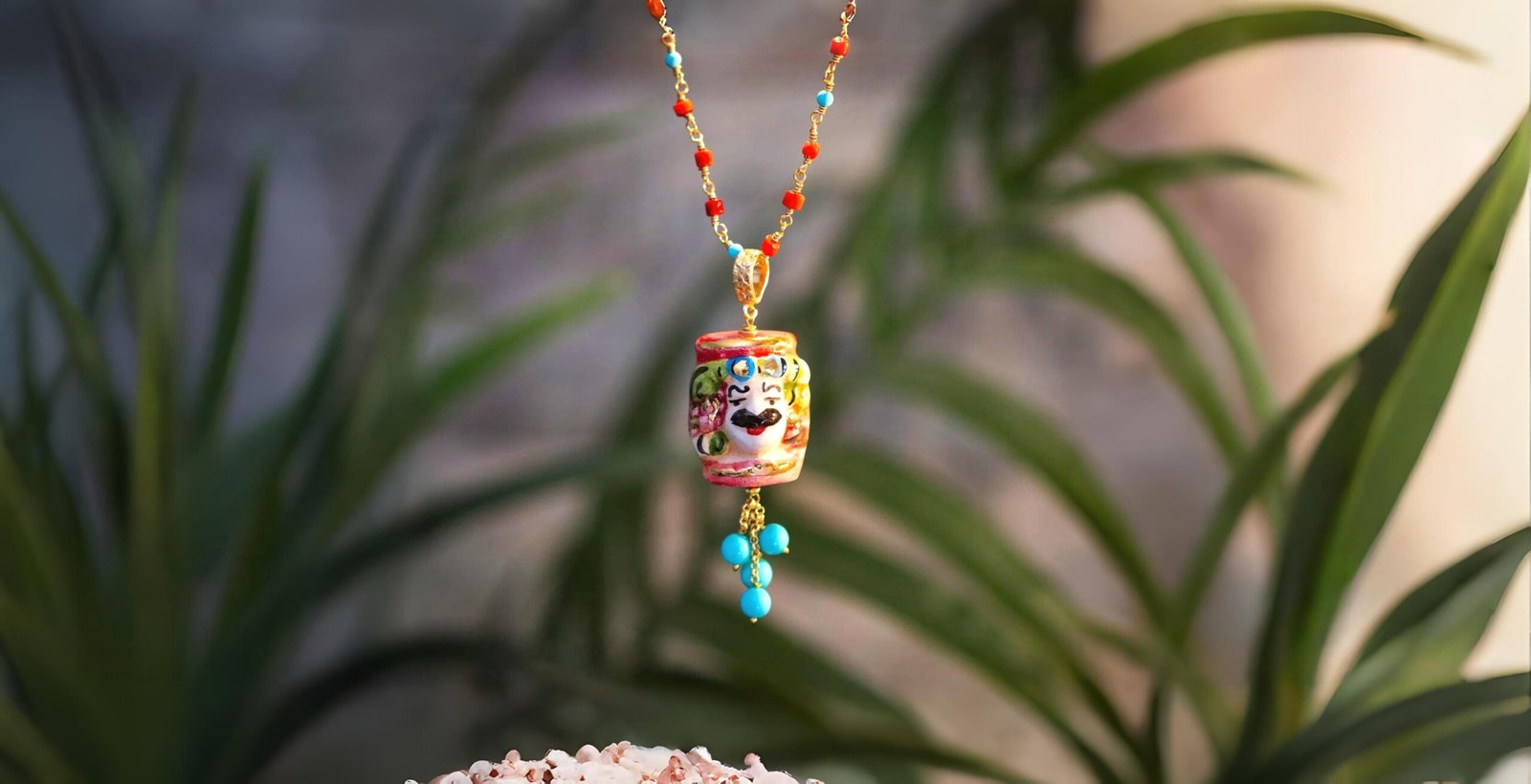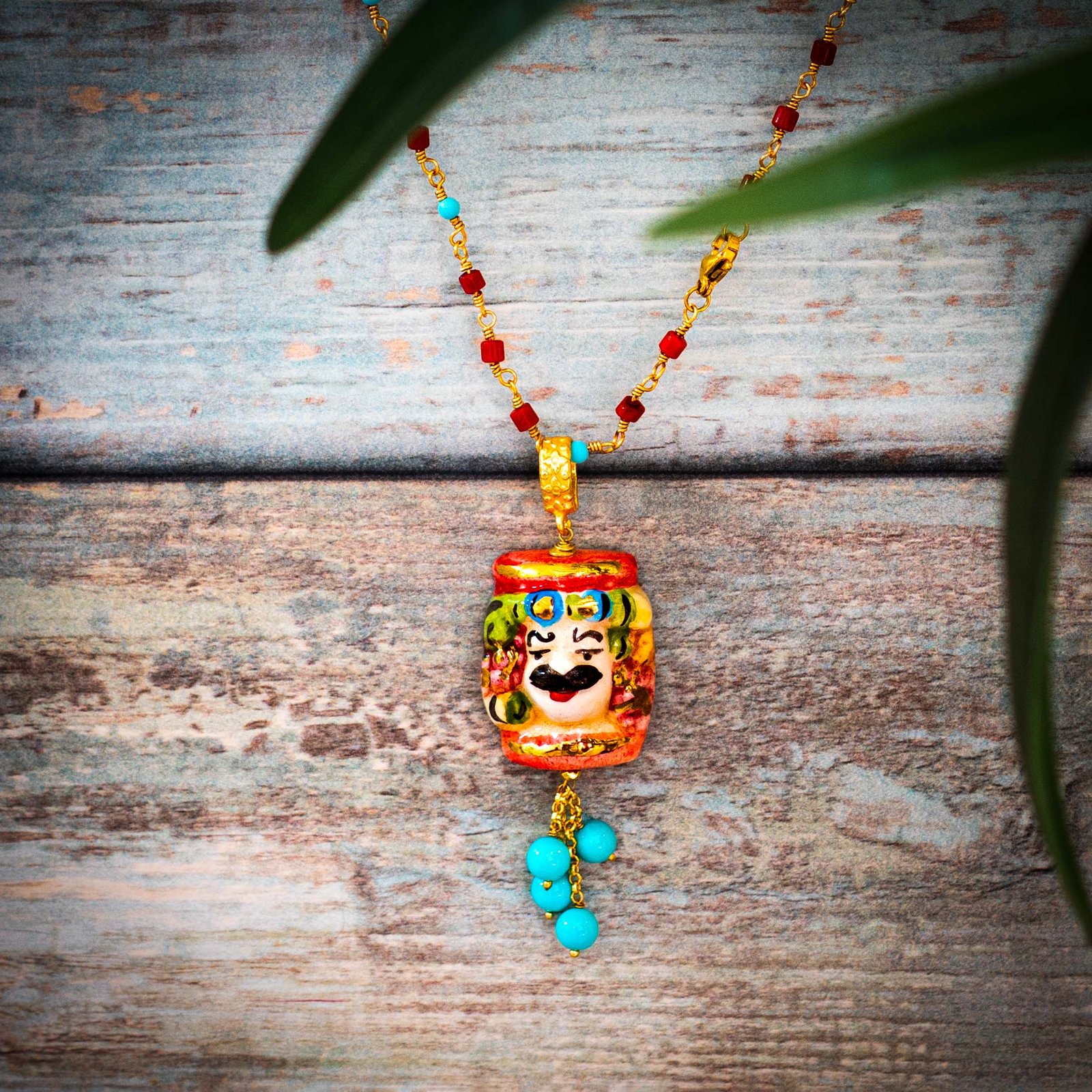 Collar de testa di moro, con el famoso Filipo Federico. El colgante es artesano y está elaborado en Sicilia, pintado a mano y esmaltado. En él predominan los colores rojos y de la cabeza del rey cuelgan piedras en color azul. La cadena que viste al moretti es de estos mismos colores, intercalando piezas en color rojo (coral italiano) y azul.