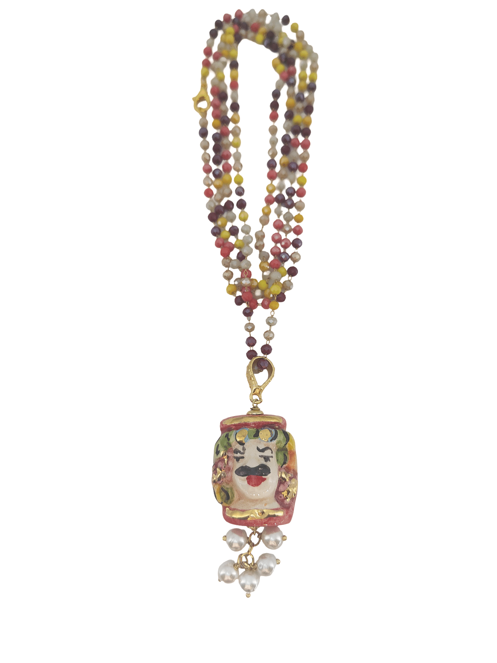 Collar de testa di moro, con el famoso Filipo Federico. El colgante es artesano y está elaborado en Sicilia, pintado a mano y esmaltado. En él predominan los colores rojos y de la cabeza del rey cuelgan piedras en color blanco. La cadena que viste al moretti es de crista, de un metro de largo, intercalando piezas en color diferentes colores que dan vida al colgante. Puede llevarse con doble vuelta. La cadena tiene apertura por lo que ambas piezas pueden utilizarse solas o separadas.