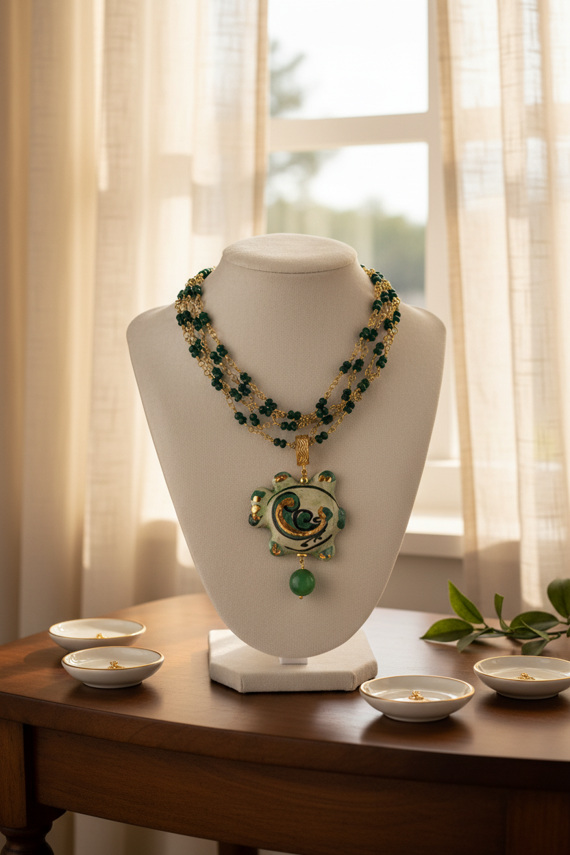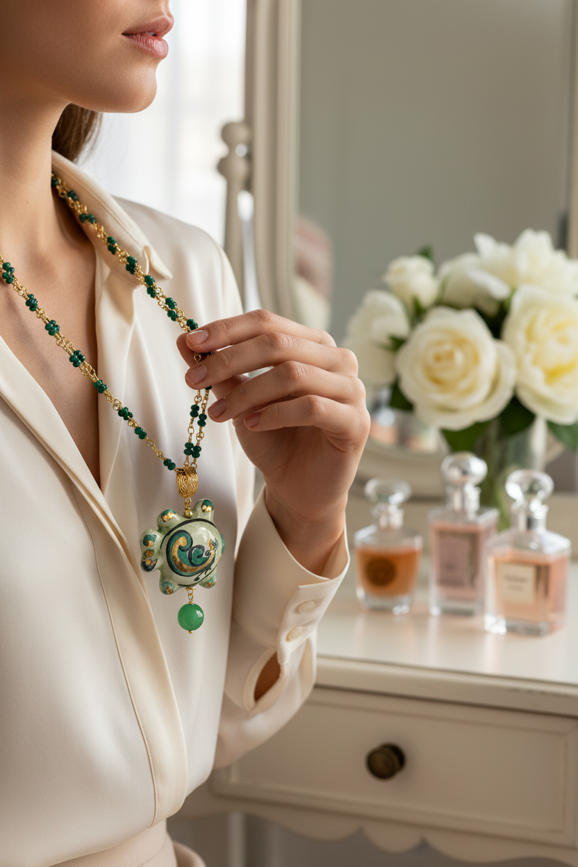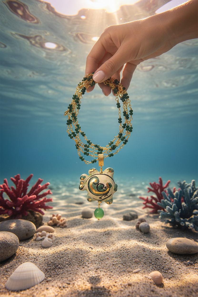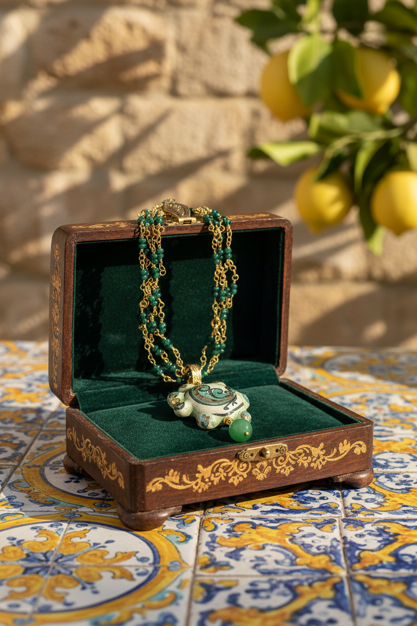 El colgante de este collar es un pez en tonos verdes. Tiene como terminación una piedra preciosa en el mismo color. Todas nuestra piezas están esmaltadas y elaboradas por artesanos en Sicilia. Cada joya es única. Pueden existir variaciones en la forma y color de los productos, puesto que están elaborados a mano. La cadena es dorada y está formada por cristales dobles de color verde, brillantes. Puede llevarse con el colgante o utilizarse por separado. Medida del colgante: 6,5 cm de largo por 5 cm de ancho Media de la cadena: 1 metro de largo