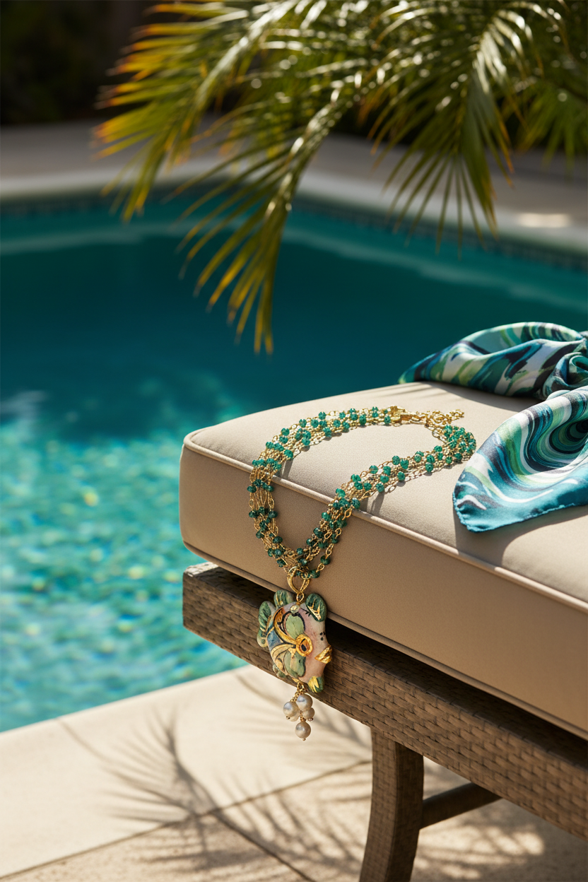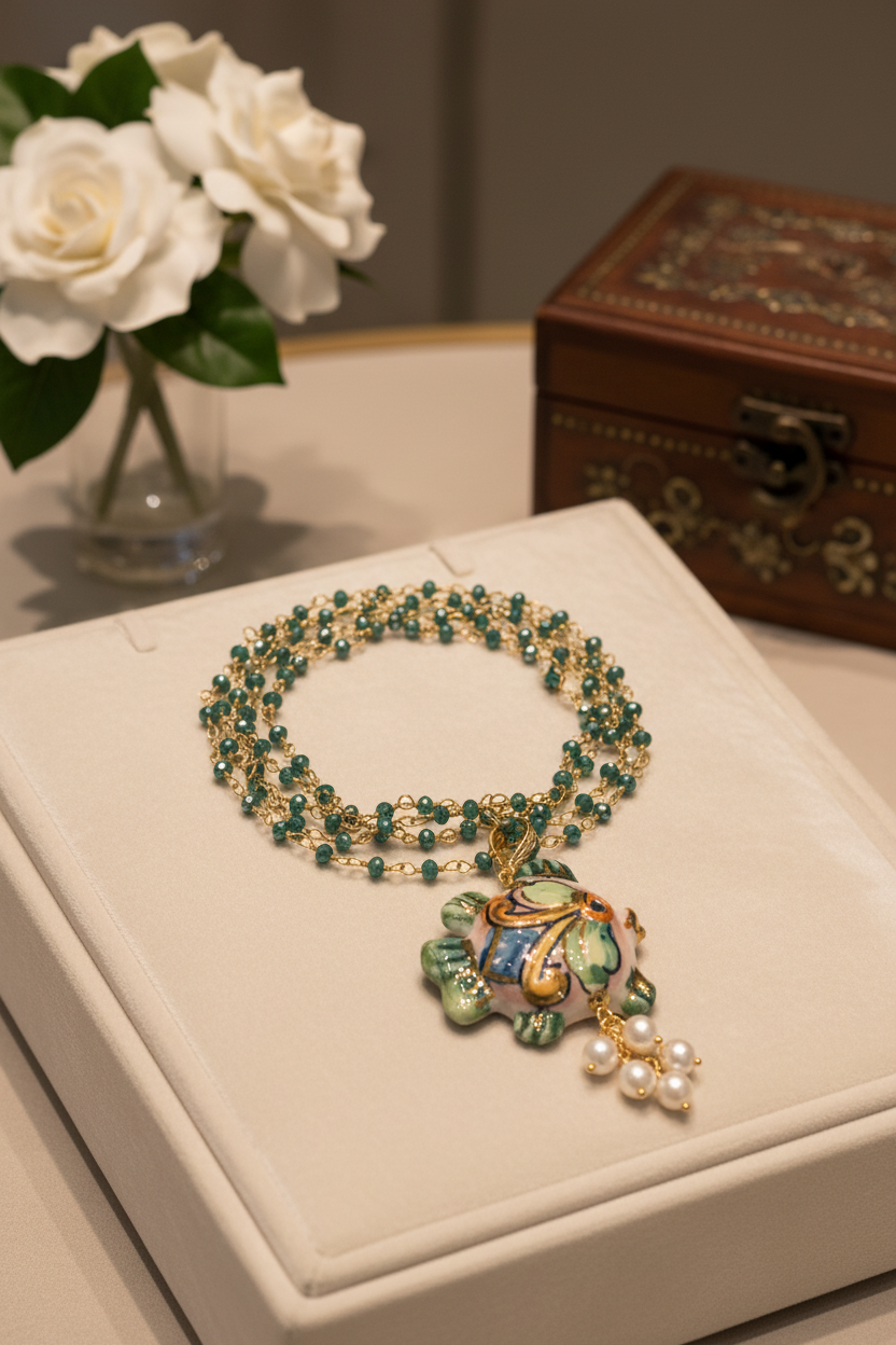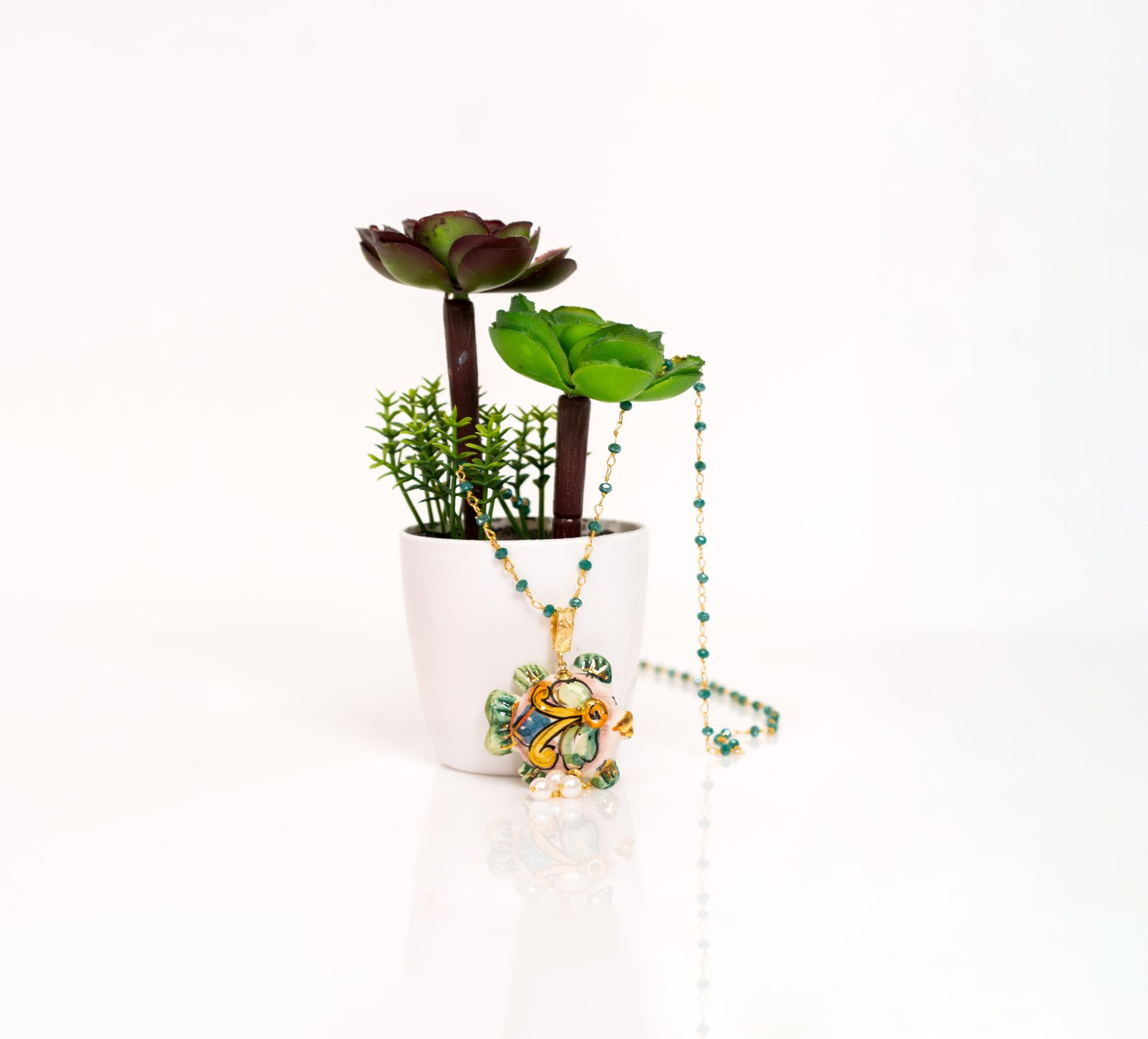 Termina con una cascada de piedras blancas. Todas nuestra piezas están elaboradas por artesanos en Sicilia. Cada joya es única. Pueden existir variaciones en la forma y color de los productos, puesto que están elaborados a mano. La cadena es de cristalitos verdes, con brillo, y cierre. Puede llevarse con el colgante o utilizarse por separado. Medida del colgante: 7,5 cm de largo por 5 cm de ancho Media de la cadena: 1 metro de largo