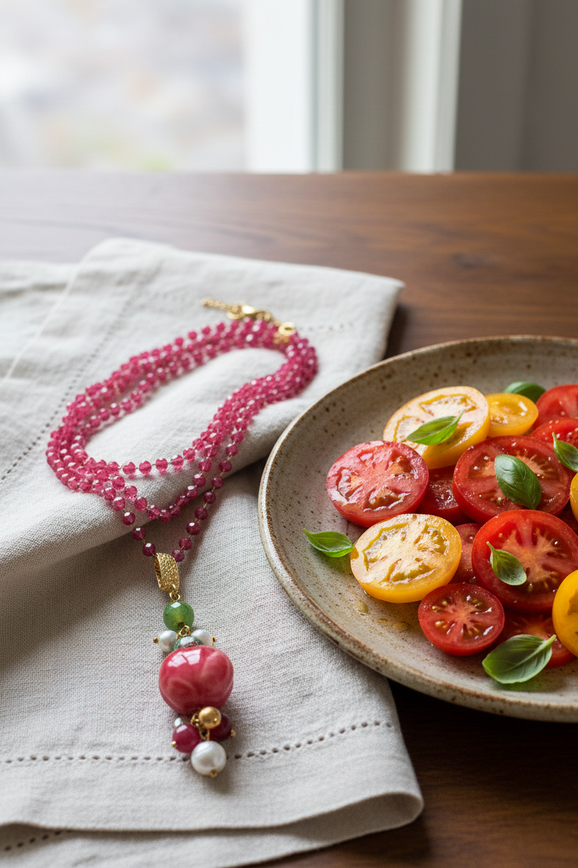 Nuestro collar de tomate no puede ser más genial. Está para comérselo. Es de color rojo y lleva piedras naturales en verde, perlas naturales y coral siciliano. Por su parte, la cadena, de un metro, está elaborada con cuentas de cristal en rojo anaranjado y lleva con un cierre de acero inoxidable. Esto permite que ambas piezas puedan utilizarse juntas o por separado. Todas nuestras piezas han sido elaboradas en Sicilia, Caltagirone, por artesanos. Cada pieza es única por lo que pueden existir variaciones de color y tamaño.
