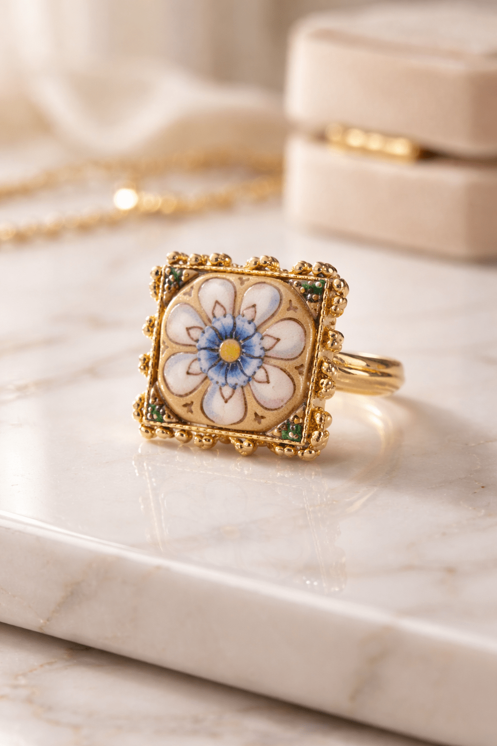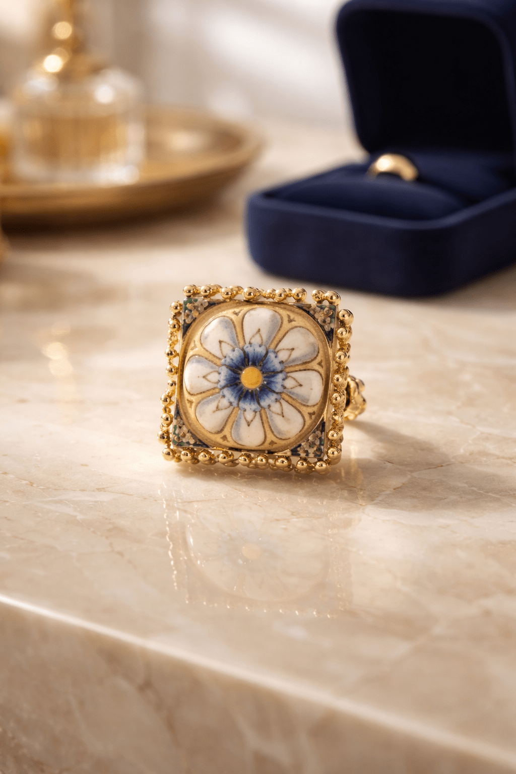 Anillo de cerámica elaborado a mano por artesanos sicilianos. Es adaptable, apto para cualquier talla e ideal para regalar. La pieza principal del anillo es un azulejo con dibujo pintado a mano de un flor en tonos blancos, azules y mostazas. La medida de la tesela es de 2,5 cm.