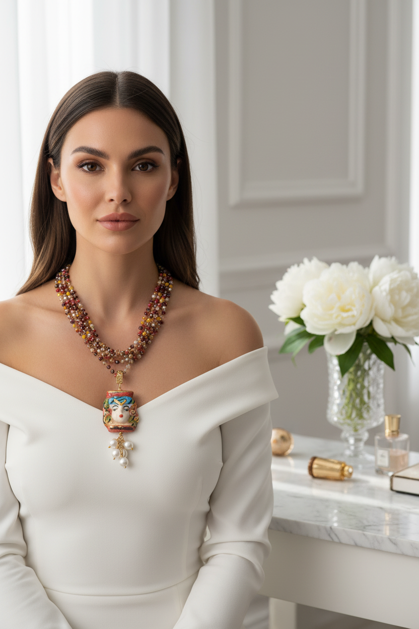 Collar de testa di moro, con el rostro de Filipa Federica. El colgante es artesano y está elaborado en Sicilia, pintado a mano y esmaltado. En él predominan los colores rojos y de la cabeza de la reina cuelgan piedras en color blanco. La cadena es de cristal intercalando piezas en color diferentes colores que dan vida al colgante. Puede llevarse con doble vuelta. La cadena tiene apertura por lo que ambas piezas pueden utilizarse solas o separadas. Medida colgante: 7 cm de largo por 3 de ancho Medida collar: 1 metro de largo