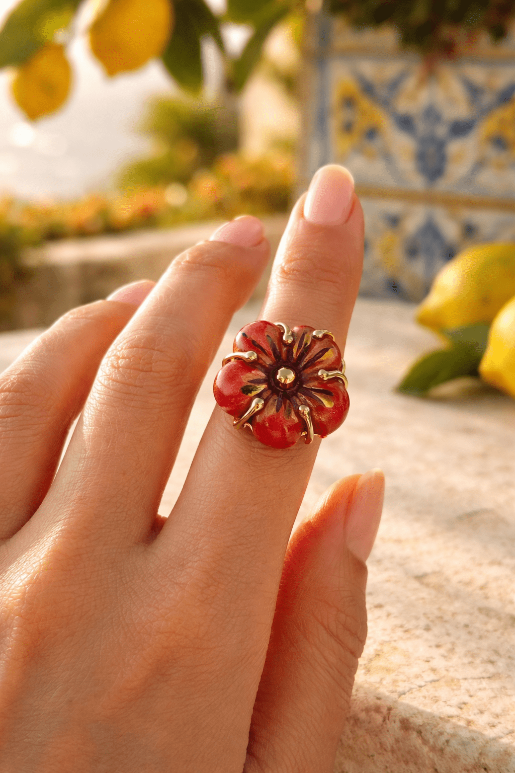 Anillo de cerámica elaborado a mano por artesanos sicilianos. Es adaptable, apto para cualquier talla e ideal para regalar. Tiene forma de flor y una medida de 2,5 cm de diametro.