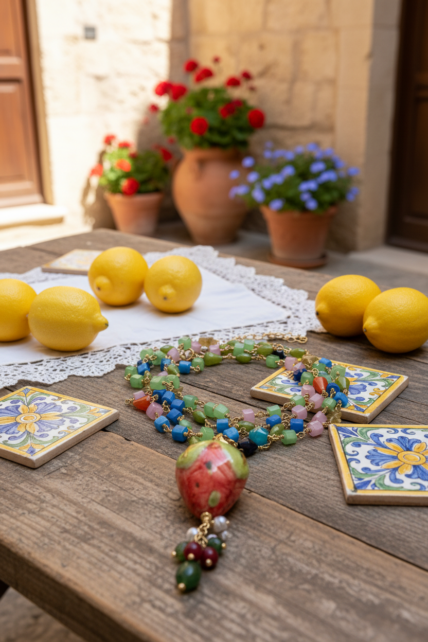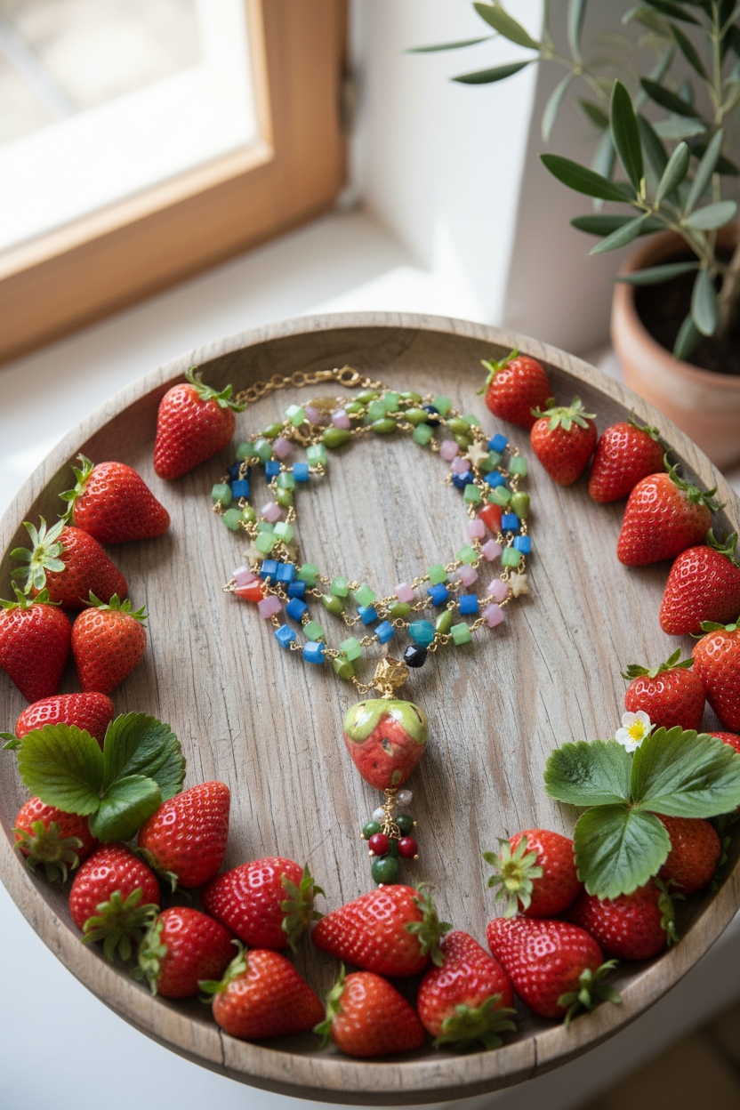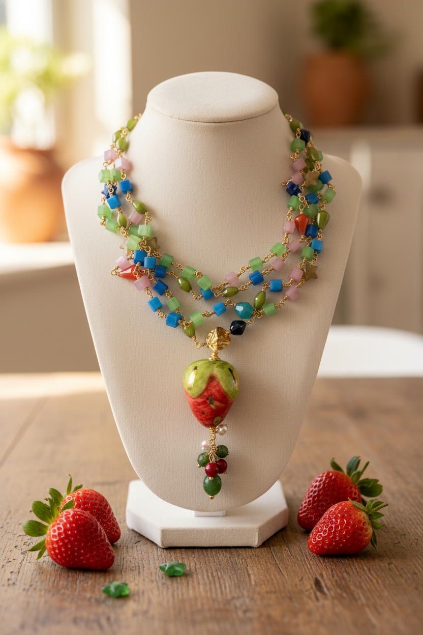 Muy apetecible esta variante de fresa. Con cadena de piedras naturales en diversos tonos armonizados con el colgante. La cadena es de un metro y cuenta con cierre de acero inoxidable. Esto permite que ambas piezas puedan utilizarse juntas o por separado. Todas nuestras piezas han sido elaboradas en Sicilia, Caltagirone, por artesanos. Cada pieza es única por lo que pueden existir variaciones de color y tamaño. Medida del colgante: en torno a 6.5 cm. Medida de la cadena: 1 metro.