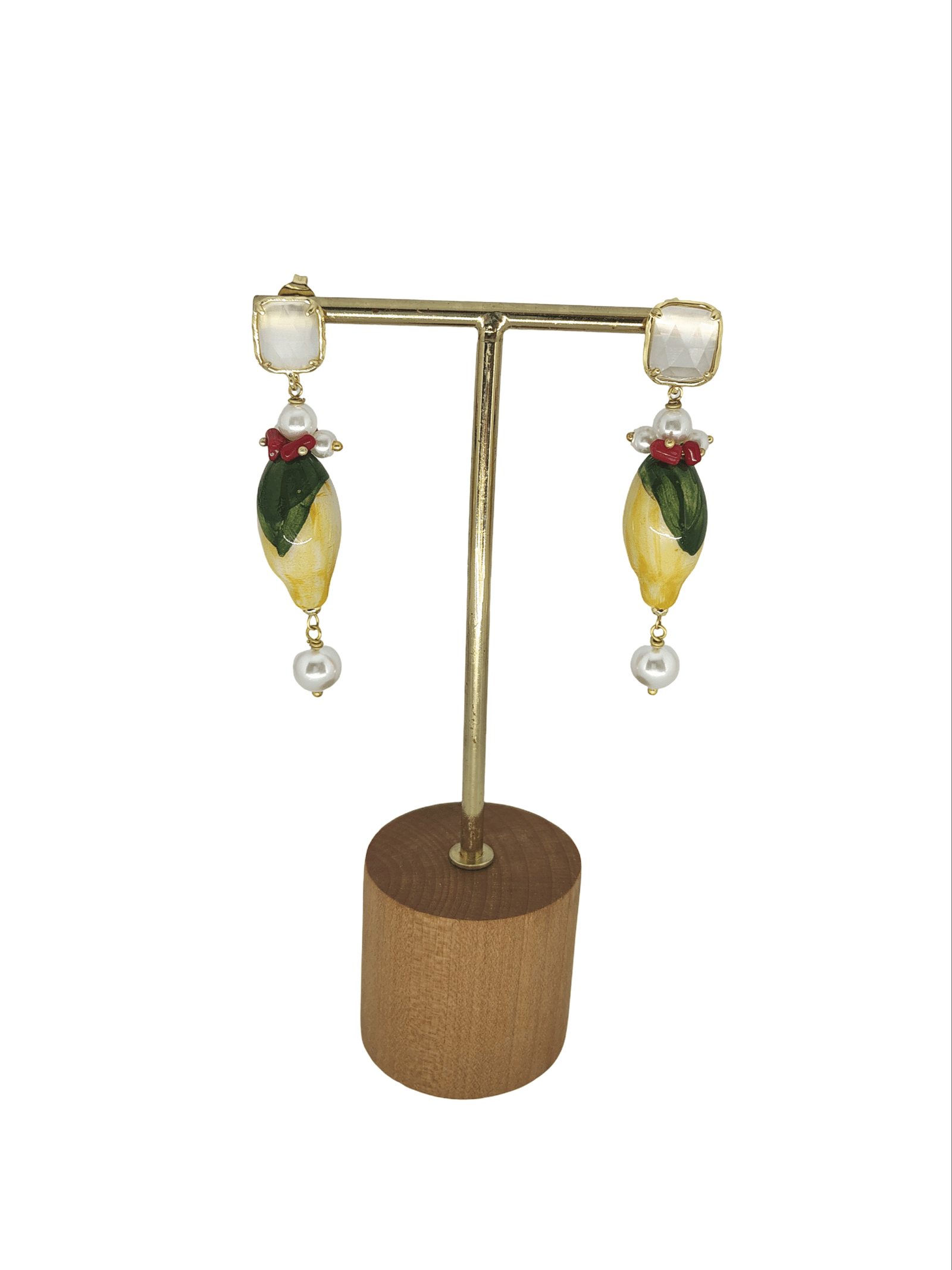 Pendientes con forma de limón y con coral italiano. Tienen una pieza bajo el limón que imita una perla. La terminacion está elegida en color blanco para aportar luz. Miden aproximadamente 6 cm de largo por 2 cm de ancho. Están realizados por artesanos sicilianos. Puede haber variaciones de tamaño y color puesto que cada pieza está hecha a mano y es única.
