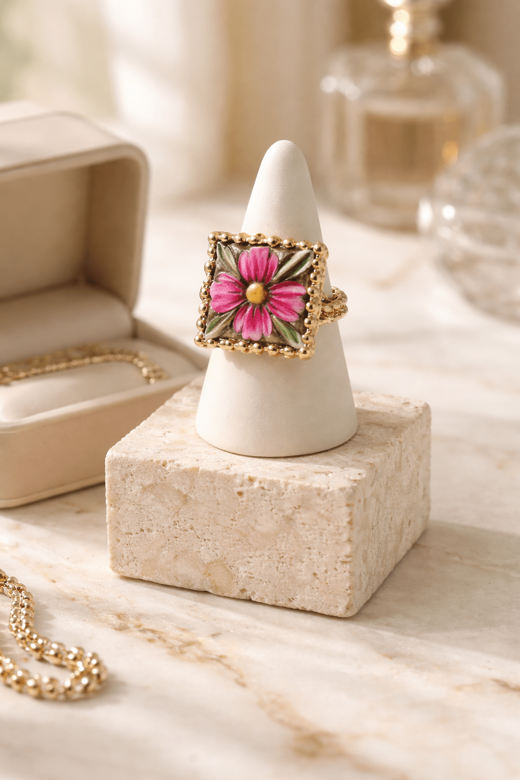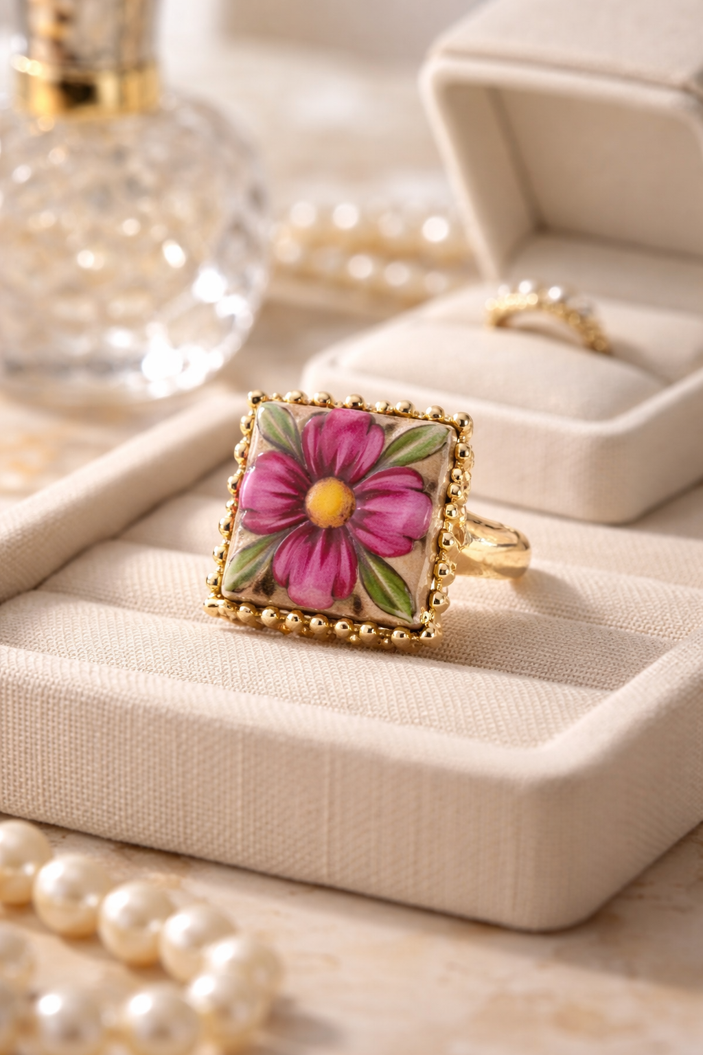 Anillo de cerámica elaborado a mano por artesanos sicilianos. Es adaptable, apto para cualquier talla e ideal para regalar. La pieza principal del anillo es un azulejo con dibujo pintado a mano de un flor magenta con hojas verdes. La medida de la tesela es de 2,5 cm.