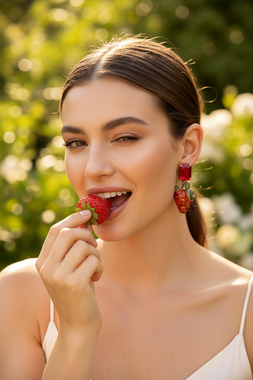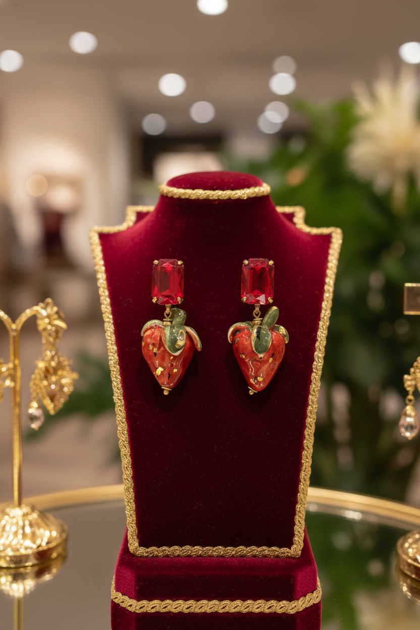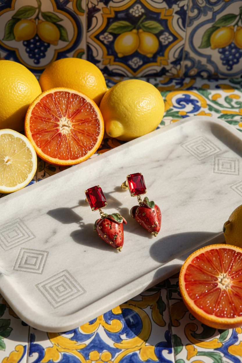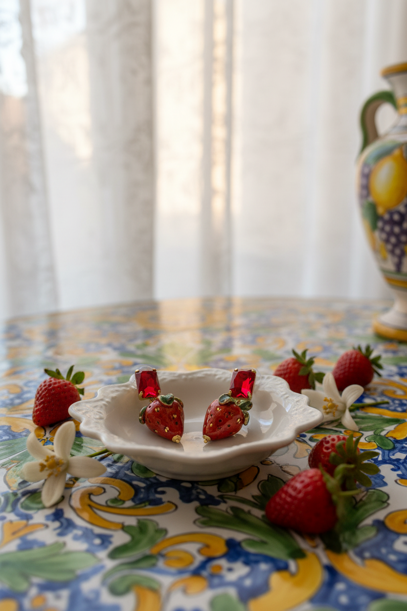 Pendientes con deliciosas fresitas. La terminación esta realizada en cristal del mismo color. Miden aproximadamente 6 cm de largo por 3.5 cm de ancho. Están diseñados en España y realizados por artesanos sicilianos. Puede haber variaciones de tamaño y color puesto que cada pieza está hecha a mano y es única.
