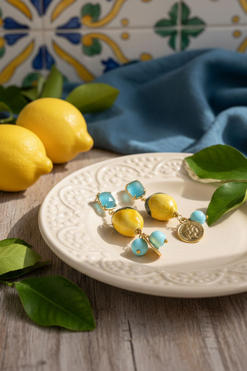 Pendientes con forma de limón, moneda y piedra azul. La terminación esta realizada en cristal azul por lo que aportan mucha luz. Miden aproximadamente 8 cm de largo por 2 cm de ancho. Están realizados por artesanos sicilianos. Puede haber variaciones de tamaño y color puesto que cada pieza está hecha a mano y es única.