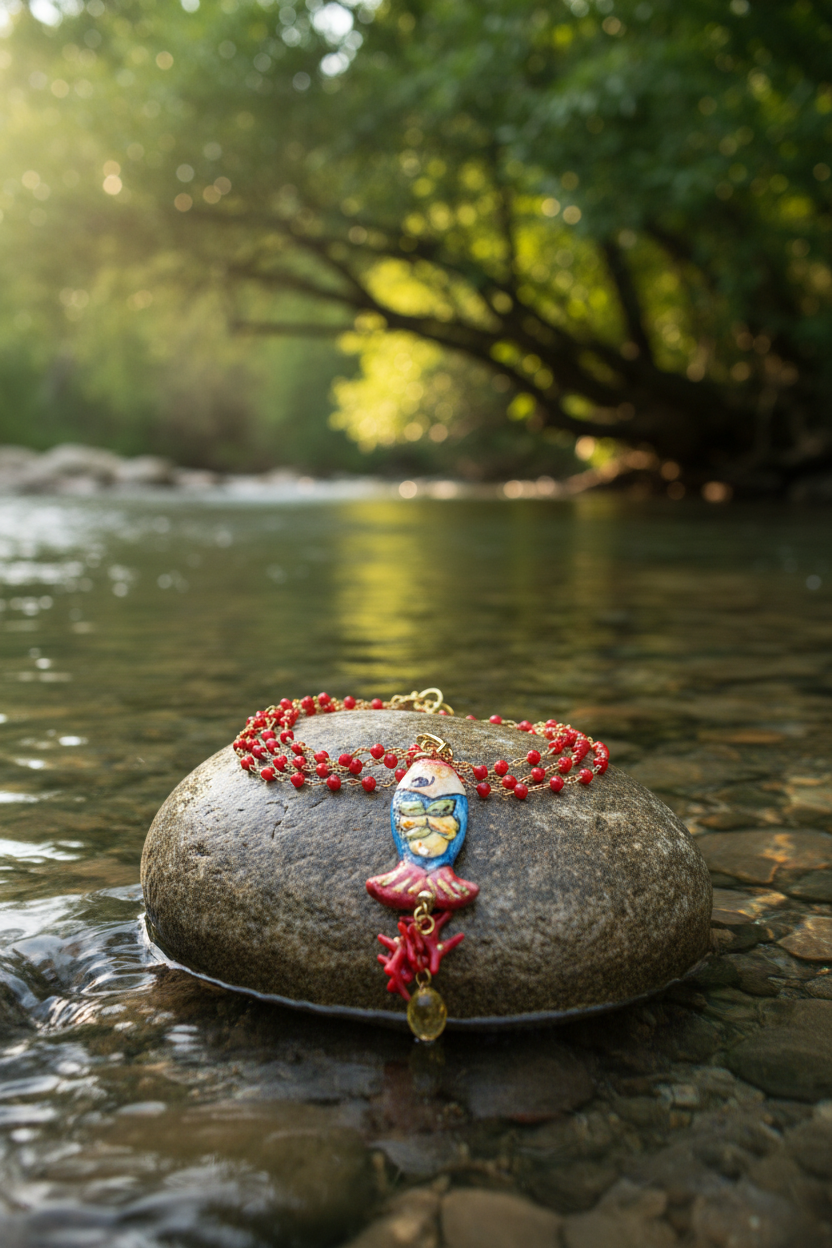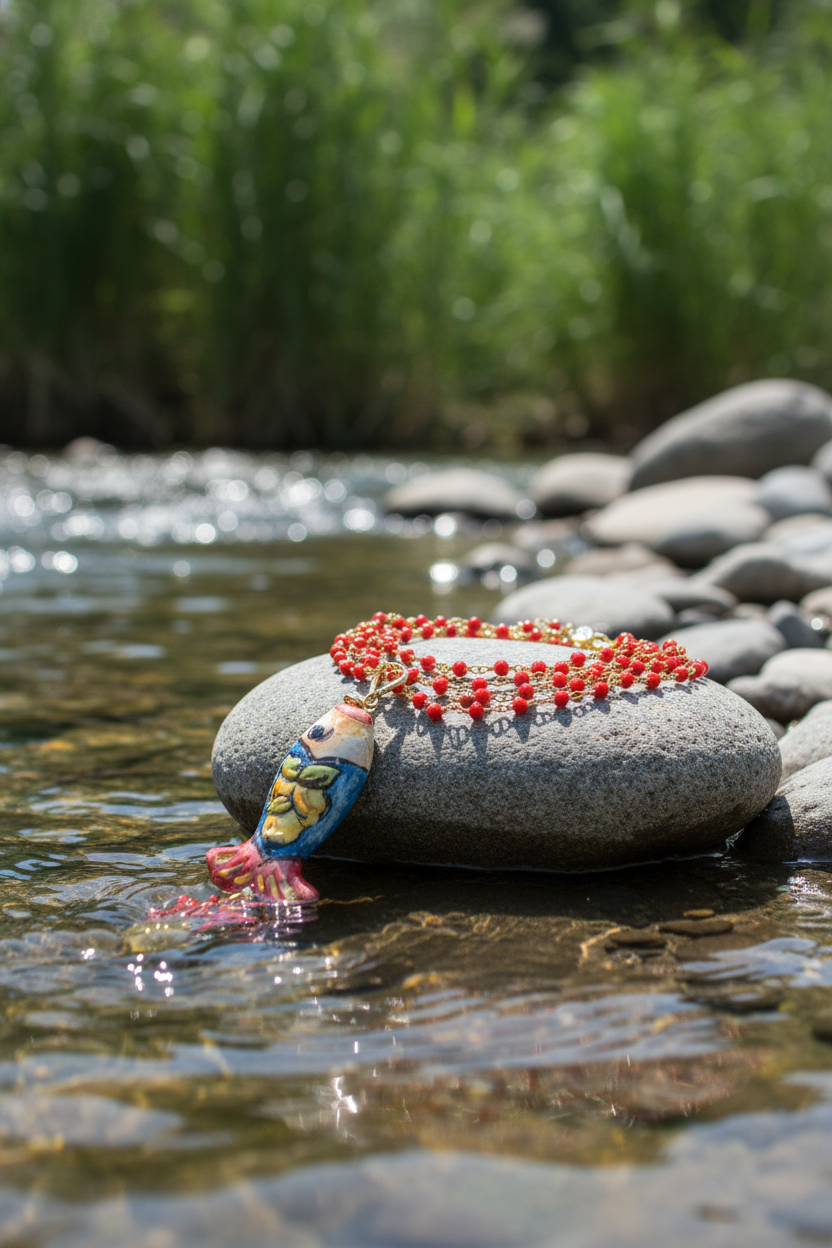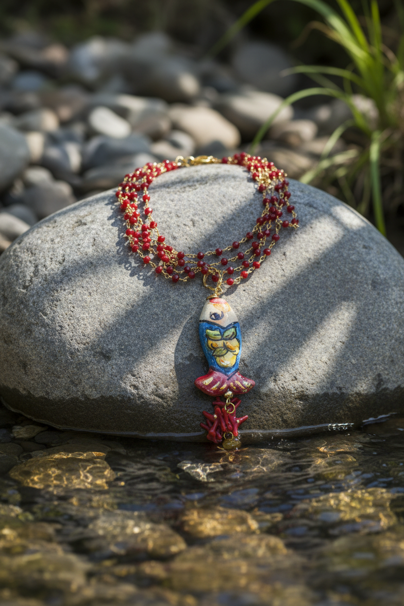 El collar del pez Sam enamora. Es divertido y favorecedor. El colgante, de tonos vivos, mezcla el naranja, azul y el rojo, como el coral siciliano que le remata. La cadena es de cristales rojos y está elaborada a mano. Mide un metro y está chapada en oro. Tiene cierre de acero inoxidable, lo que permite que las piezas puedan utilizarse por separado. Todas nuestros productos están esmaltados y elaborados por artesanos en Sicilia. Cada joya es única. Pueden existir variaciones en la forma y color de los productos, puesto que están elaborados a mano. Medida del pez : 7 cm aproximado