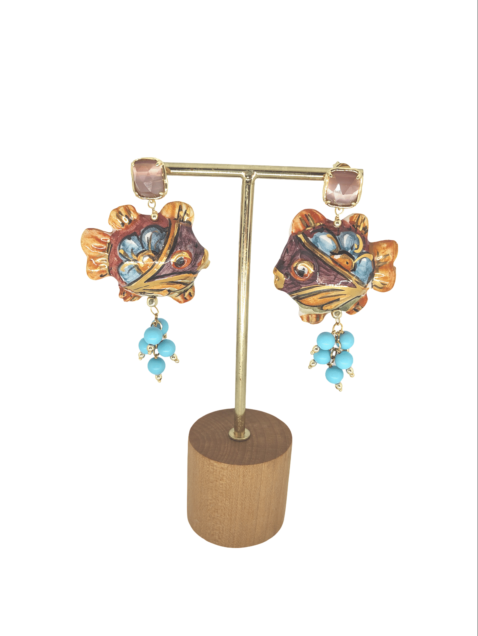 Estos pendientes de pececitos de cerámica están realizados en colores tostados y azules y tienen una cascada de piedras azules bajo la figura principal. En la terminación cuentan con un cristal también en tonos marrones que da luz a la mujer que los elija. Miden aproximadamente 7 cm de largo por 4cm de ancho. Puede haber variaciones de tamaño y color puesto que cada pieza está hecha a mano y es única. Realizado a mano por artesanos sicilianos.