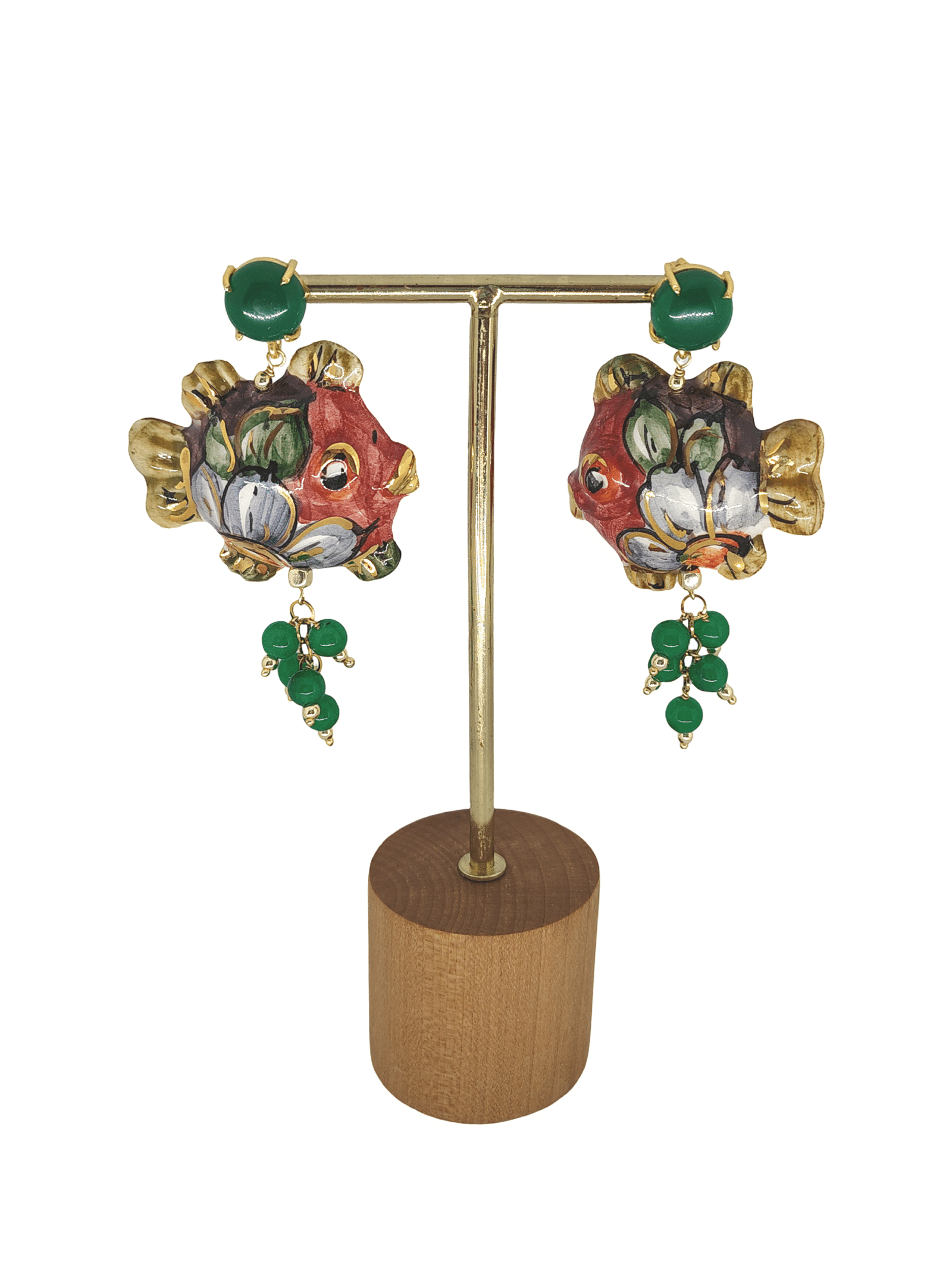 Estos pendientes de pececitos de cerámica están realizados en tono multicolor y tienen una cascada de piedras verdes bajo la figura principal. En la terminación está realizada también en tonos verdes. Miden aproximadamente 7 cm de largo por 4cm de ancho. Puede haber variaciones de tamaño y color puesto que cada pieza está hecha a mano y es única. Están realizados a mano por artesanos sicilianos.
