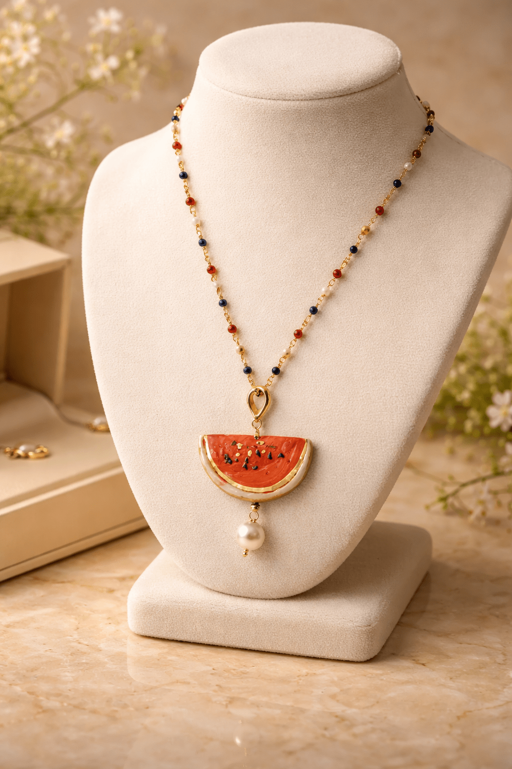 Rajita de sandía dulce y fresca, rematada con una perla.La cadena es de un metro de color rojo, azul y blanco y cuenta con cierre de acero inoxidable. Esto permite que ambas piezas puedan utilizarse juntas o por separado. Todas nuestras piezas han sido elaboradas en Sicilia, Caltagirone, por artesanos. Cada pieza es única por lo que pueden existir variaciones de color y tamaño. Medida del colgante: en torno 5 cm de largo por 4 de ancho Medida de cadena: 1 metro